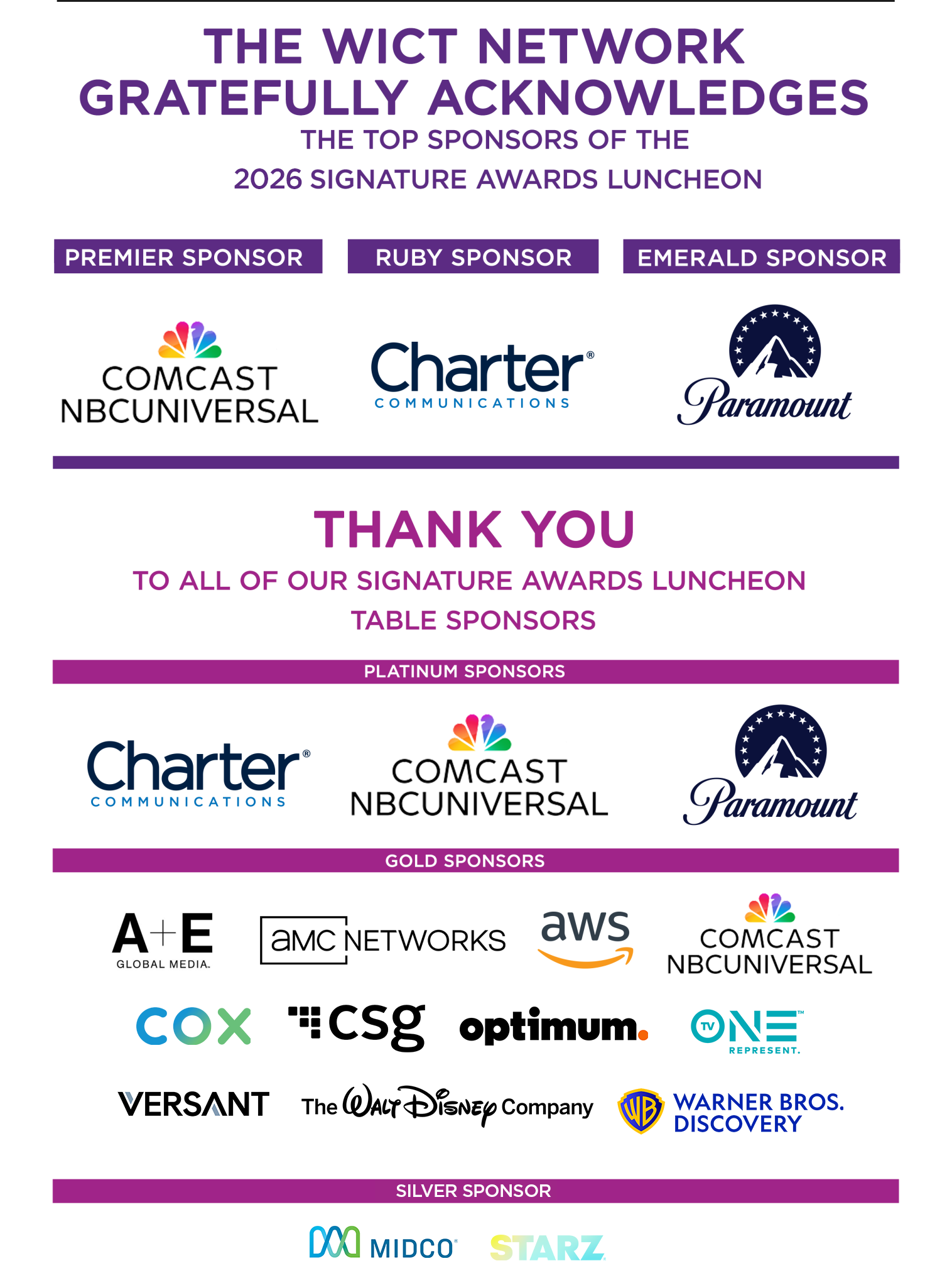 The WICT Network Signature Awards Luncheon recognizes the leaders and organizations that are paving the way for the development of women in the media industry. The luncheon honors the industry’s best and brightest for their embodiment of The WICT Network Touchstones, which serve as the origin for all our initiatives. Among the accolades presented are the Woman to Watch and Woman of the Year.